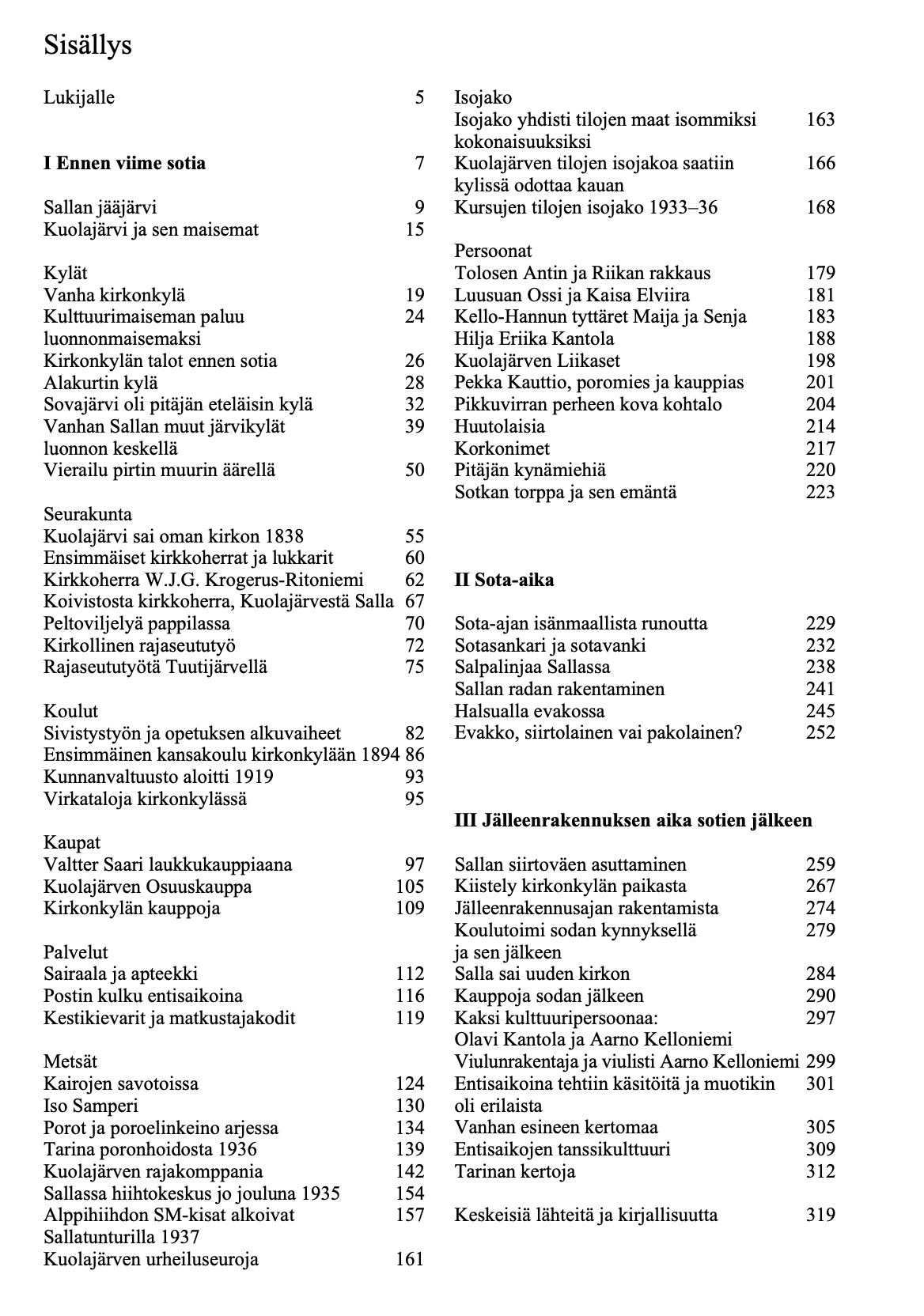 Kaarlo Kantolan uutuuskirja on aikamatka itärajan taakse jääneelle sallalaisten kotiseudulle Kuolajärvelle eli Vanhaan Sallaan. Teoksessa on vuosikymmenten takaa yli 200 valokuvaa, paljon harvinaisia kuvia erityisesti sotia edeltävältä ajalta.